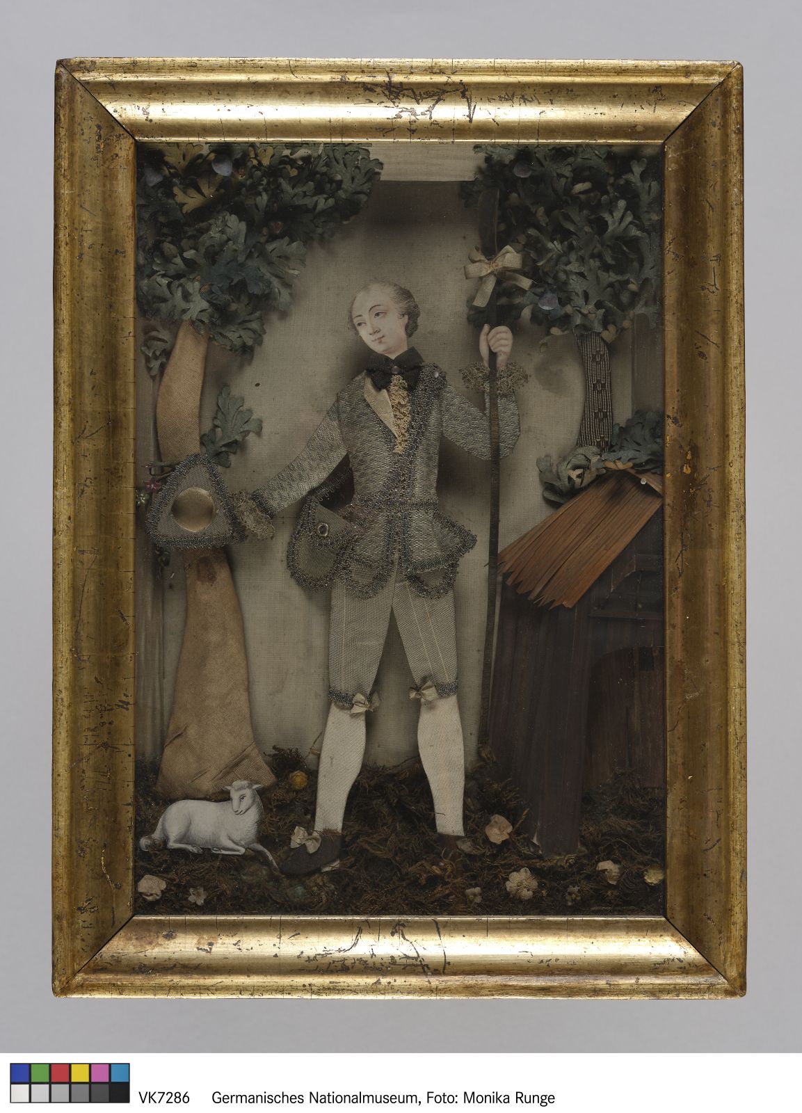 Holzrahmen, vergoldet, Glas; Pappe, Seide. Aquarell, Moos, Stroh (Stall, Holz), Lahn, Blech Schäferstab (Silberblech?)