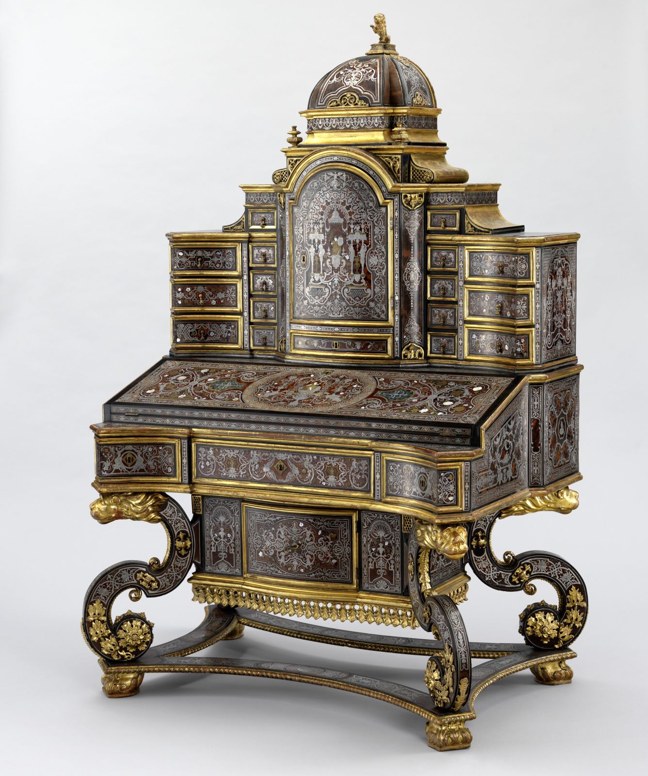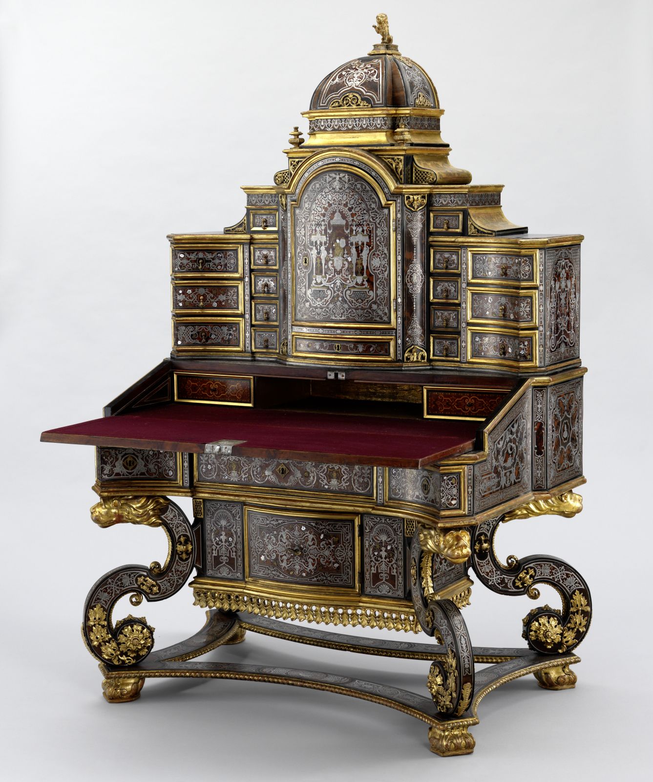 Ein Kunstschreiner der Spitzenklasse, der die komplizierte Dekoration in Boulle-Technik beherrschte, war Ferdinand Plitzner (1678–1724). Nach seiner Ausbildung in der Ansbacher Hofschreinerei war er in Wien und Würzburg tätig und fertigte den Prunkschreibtisch schließlich um 1715/20 an. Als Materialien verwendete er Eiche und Kiefer sowie Schildplatt, Horn, Messing, Zinn, Kupfer, Perlmutt und verschiedene Hölzer für die Einlegearbeiten. Der Auftraggeber des luxuriösen Möbelstücks ist unbekannt, zählte aber mit hoher Wahrscheinlichkeit zum europäischen Adel.