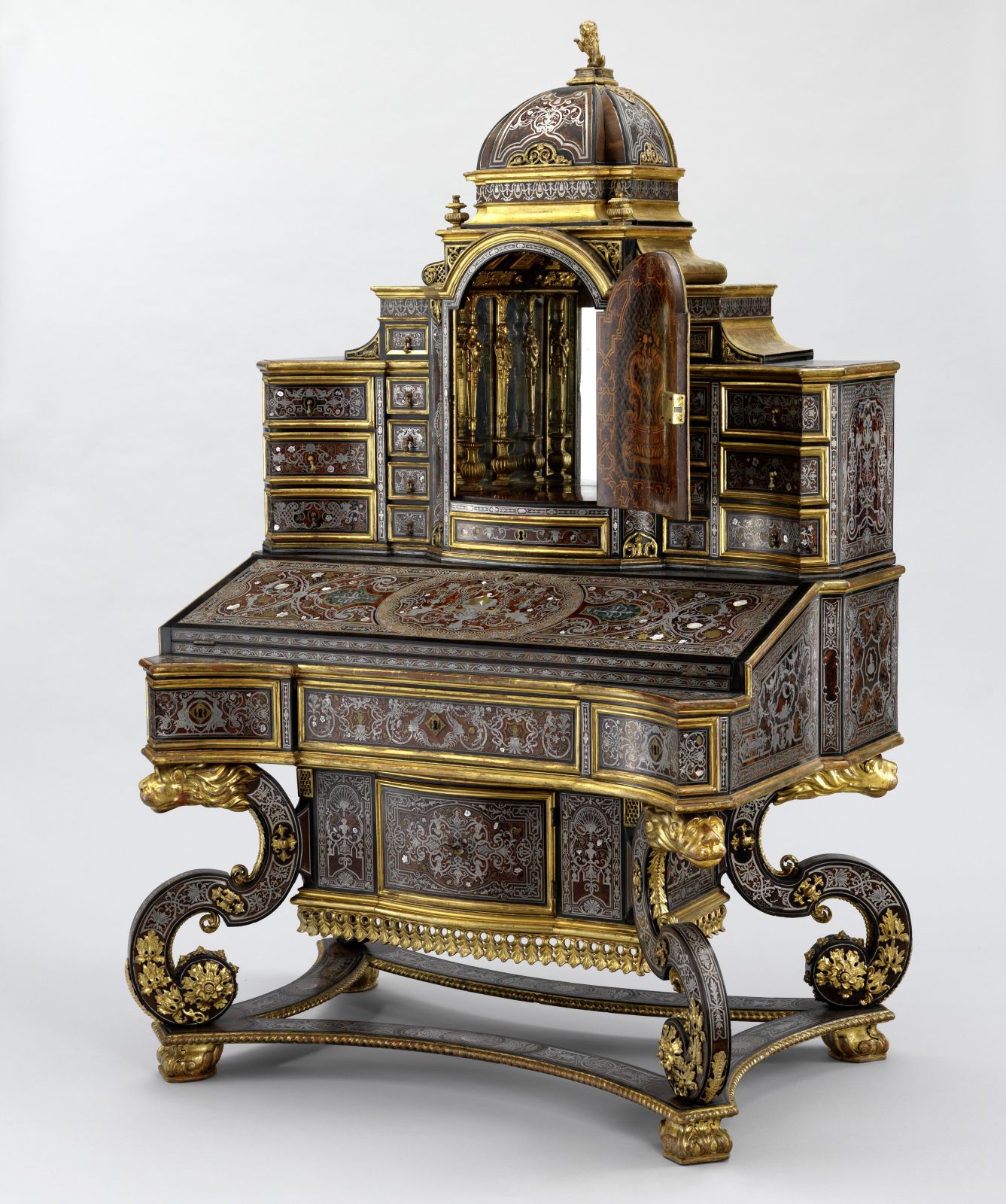 Bei der im frühen 18. Jahrhundert besonders beliebten Dekorationsform in Boulle-Technik kombinierte man Metallfurniere mit anderen Materialien wie Schildplatt oder Perlmutt in kunstvollen Einlegearbeiten, der sogenannten Marketerie. Dabei entstand eine Oberfläche mit besonderem Material- und Farbkontrast in vielseitigen Designs – häufig florale und ornamentale Motive. Benannt ist die Technik nach dem französischen Kunsttischler und Hofebenisten André-Charles Boulle (1642–1732). Dieser diente unter Ludwig XIV. am Hof von Versailles und war für seine innovativen und qualitativen Arbeiten berühmt.