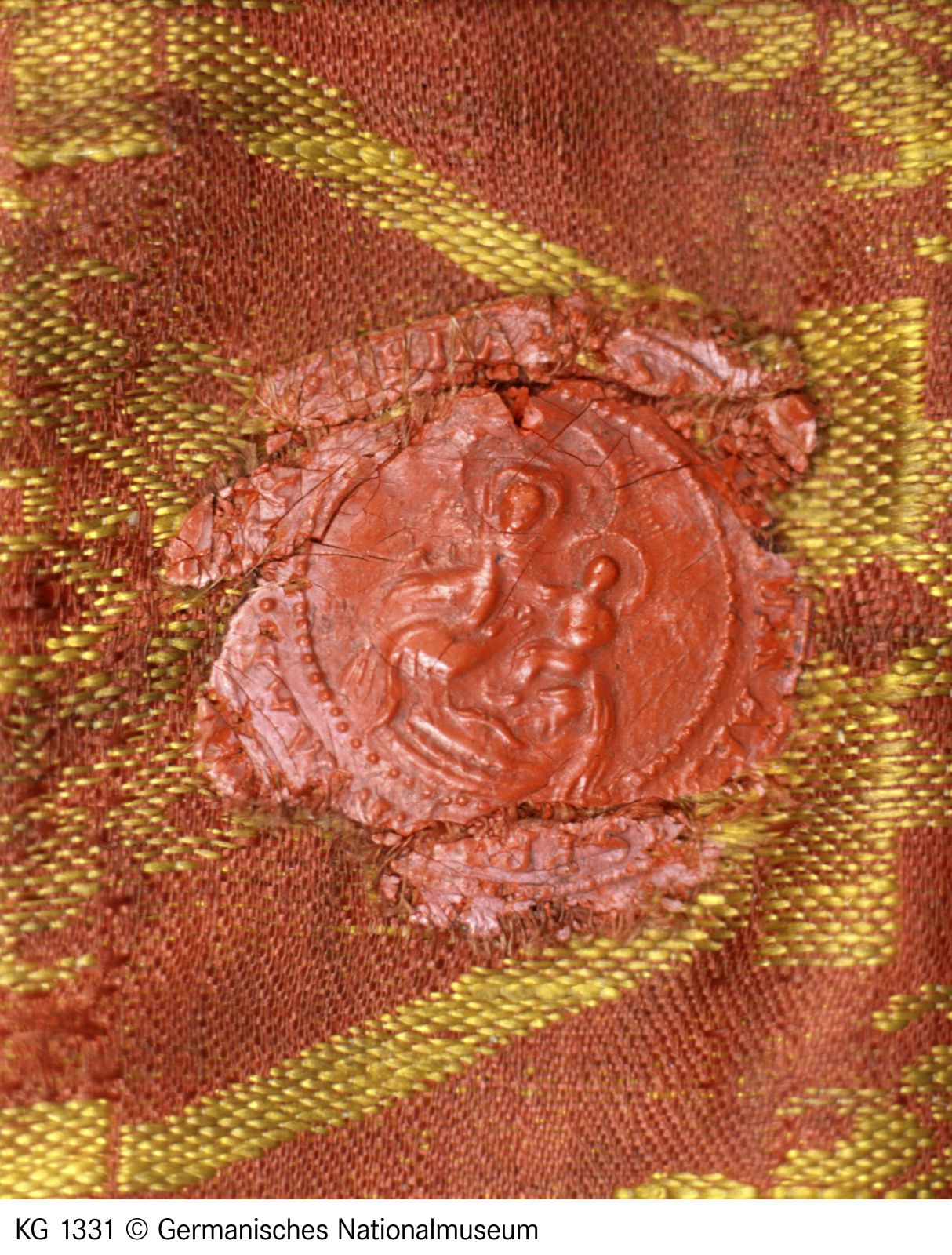 Damast, Atlasbindung, broschiert, Kette: Seide, weiß, Schuss: Seide, rotviolett, grün, Metallfaden Lahn, goldfarben, Seele Seide, Futter Lampas, Seide, rot, gelb, Stäbe Leinen, Stickerei Seide, mehrere Farben, Spaltstich, Flachstich, Leinen, Metallfäden, Anlegetechnik, Leder, Vorzeichnung, auf dem Futter 2 Lacksiegel