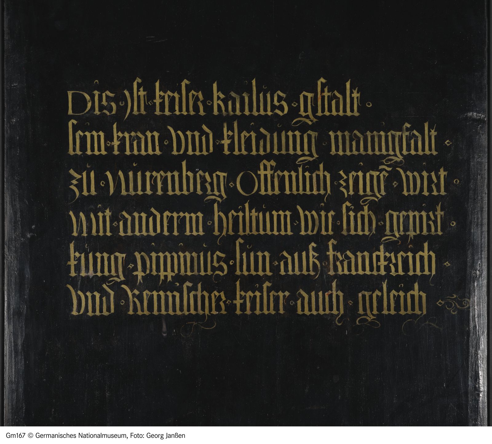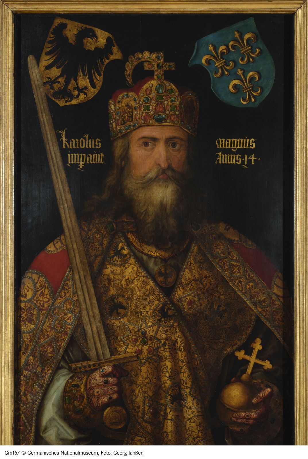 Ernst und mächtig – so tritt Kaiser Karl der Große (747/8–814) in Albrecht Dürers Bildnis auf. Deswegen wurde es schon oft mit Darstellungen Gottvaters verglichen. Bis heute ist die Vorstellung Kaiser Karls des Großen von diesem Gemälde geprägt. Jedoch heißt es in der Inschrift auf dem Rahmen, dass das Bild der „wahren Gestalt“ Karls nur ähnlich sei. Von dessen Tod bis zur Entstehung von Dürers Werk vergingen fast 700 Jahre. Realitätsgetreue zeitgenössische Porträts Karls des Großen, die Dürer als Vorlage hätten dienen können, gab es nicht.