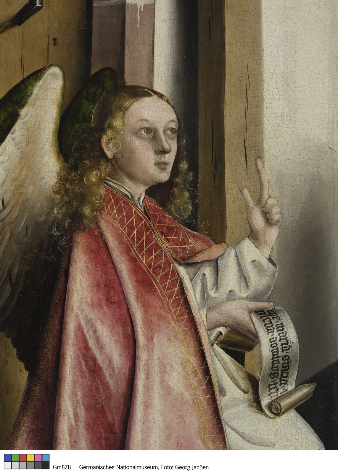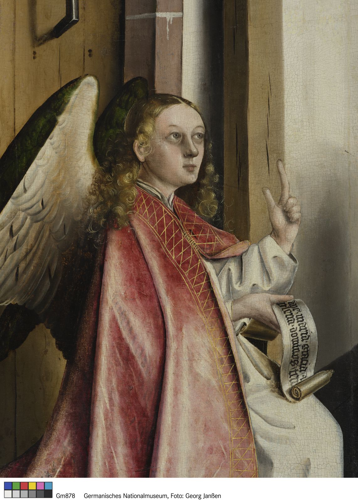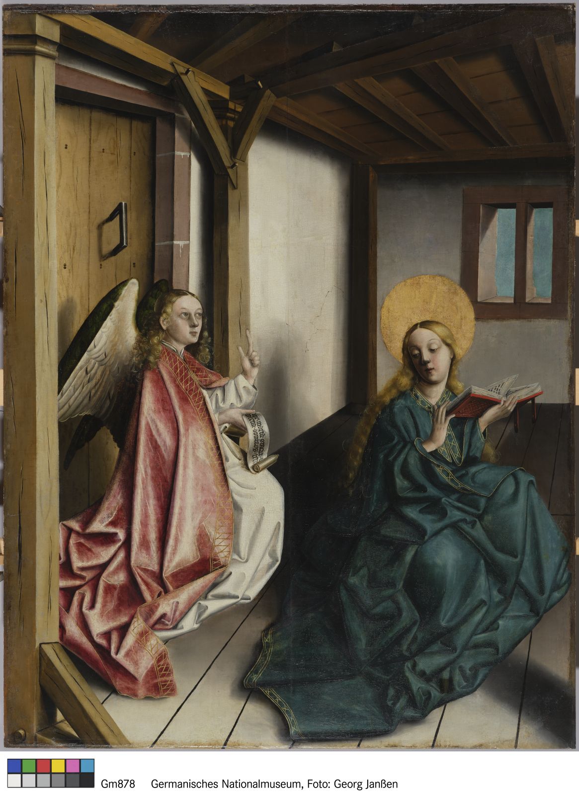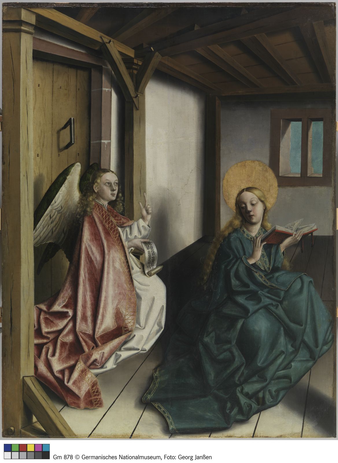 Vollkommen auf das Wesentliche reduziert gibt Konrad Witz die Erzählung aus dem Lukasevangelium wieder: Der Erzengel Gabriel überrascht Maria mit der Botschaft, dass sie schwanger werden und Gottes Sohn zur Welt bringen wird (Lk 1, 26–38). Der Maler hat die Szene in einen kargen Raum verlegt. Kein Mobiliar, kein schmückendes Beiwerk lenken den Blick von den monumentalen Figuren ab. Als müsse er die Wahrhaftigkeit des Geschehens betonen, hält der Maler stattdessen kleinste Details des kargen Raumes fest: die Maserung der Holzbalken, die Risse im Putz und den Mörtel, der aus den Fugen quillt. Dass der Engel den Raum durch eine verschlossene Tür betreten hat, ist als theologische Aussage zu verstehen: Verbildlicht ist der Widerspruch, dass Maria schwanger werden kann und gleichzeitig ihre Jungfräulichkeit behält. Wie die Kammer ist ihr Leib im einen Moment noch leer, bevor sie kurze Zeit später – so unerklärlich wie das Eintreten des Engels – den Gottessohn in sich trägt.