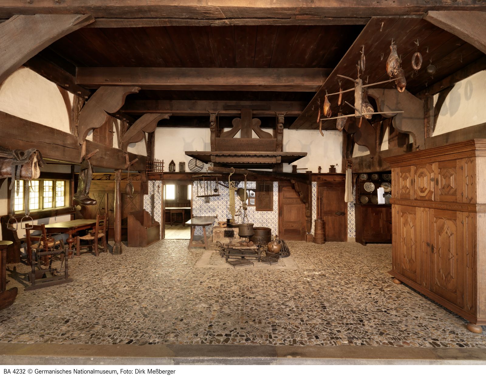 Der nicht originale hölzerne Funkenschirm über dem Herd hielt das Flugfeuer von der Balkendecke und dem leicht entflammbaren Dach fern. Er drängte zudem den Rauch durch die Türen der Abseiten aus dem Haus, denn einen Schornstein gab es hier nicht. Der Rauch konservierte Würste und Schinken, er schützte Getreide und Dach vor Ungeziefer, jedoch führte er oft zu Augenleiden. An dem schwenkbaren Wendebaum hängt ein höhenverstellbarer Kesselhaken, durch den der Abstand des Topfes zum Feuer und somit die Wärmezufuhr beim Kochen reguliert wurde.