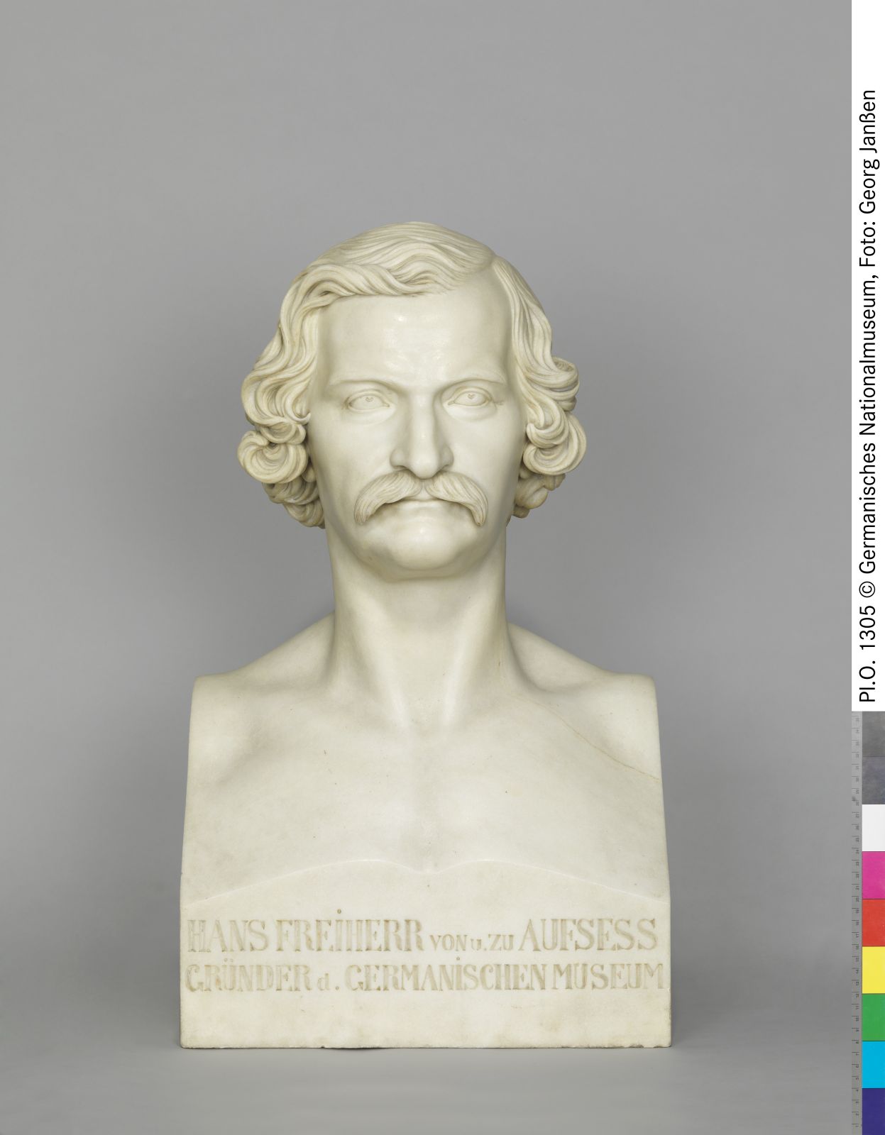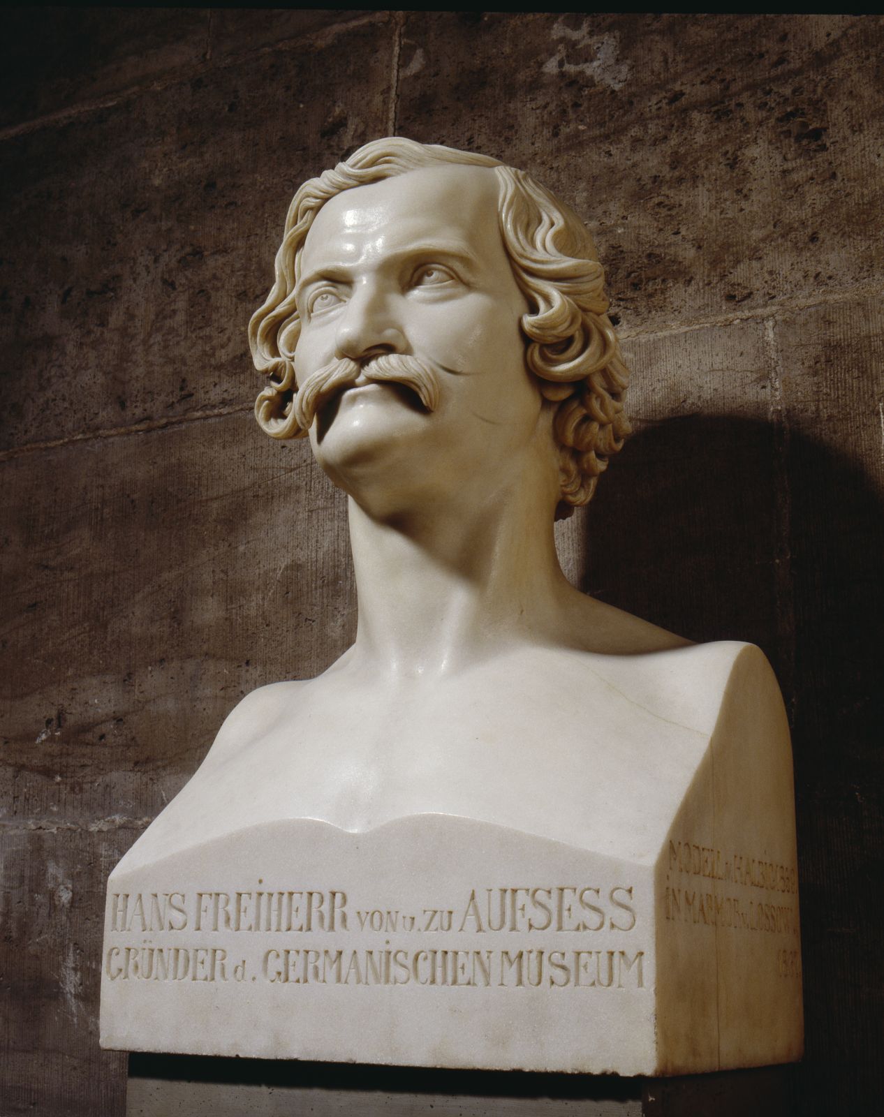 Die Büste des Freiherrn von und zu Aufseß ist heute in der sogenannten Ehrenhalle des Germanischen Nationalmuseums ausgestellt und erinnert an den passionierten Sammler und die Anfänge des Museums.