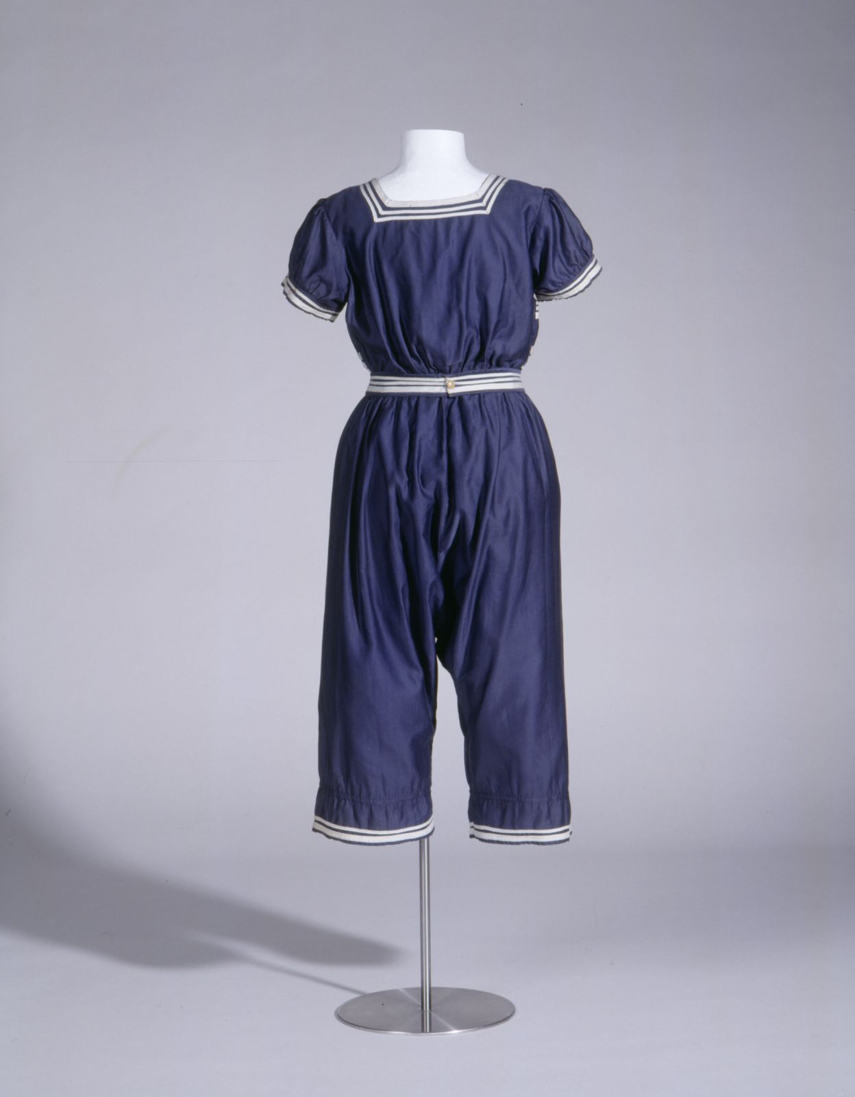 Baumwolle, blau; Atlasbindung; Band; Baumwolle, weiß; Knöpfe: Glas; Druckknöpfe. - Hand-, Maschinenstickerei