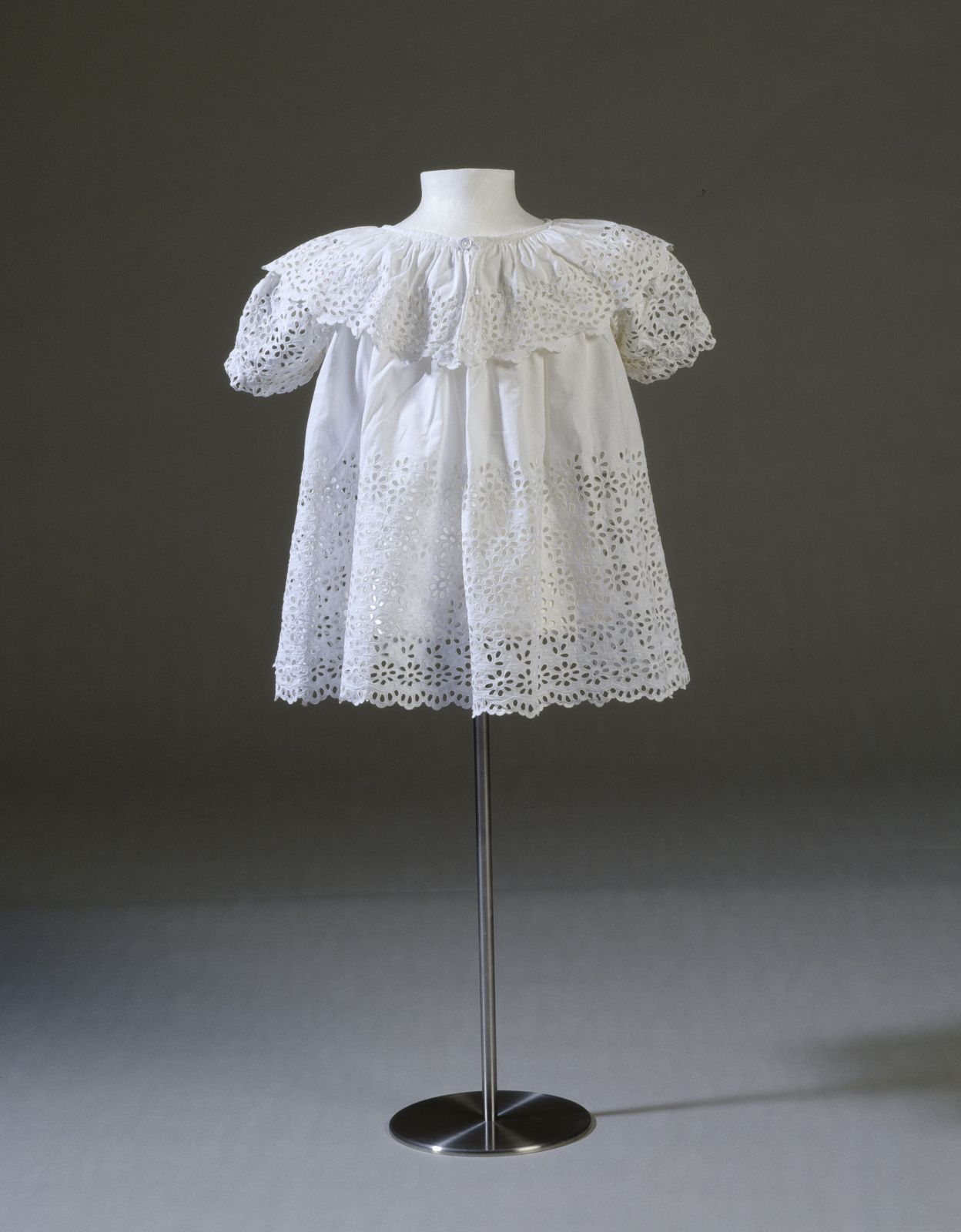Baumwolle, weiß; Leinwandbindung; Textilgummiband; Knöpfe: Schildpatt. - Stickerei: Baumwolle, weiß