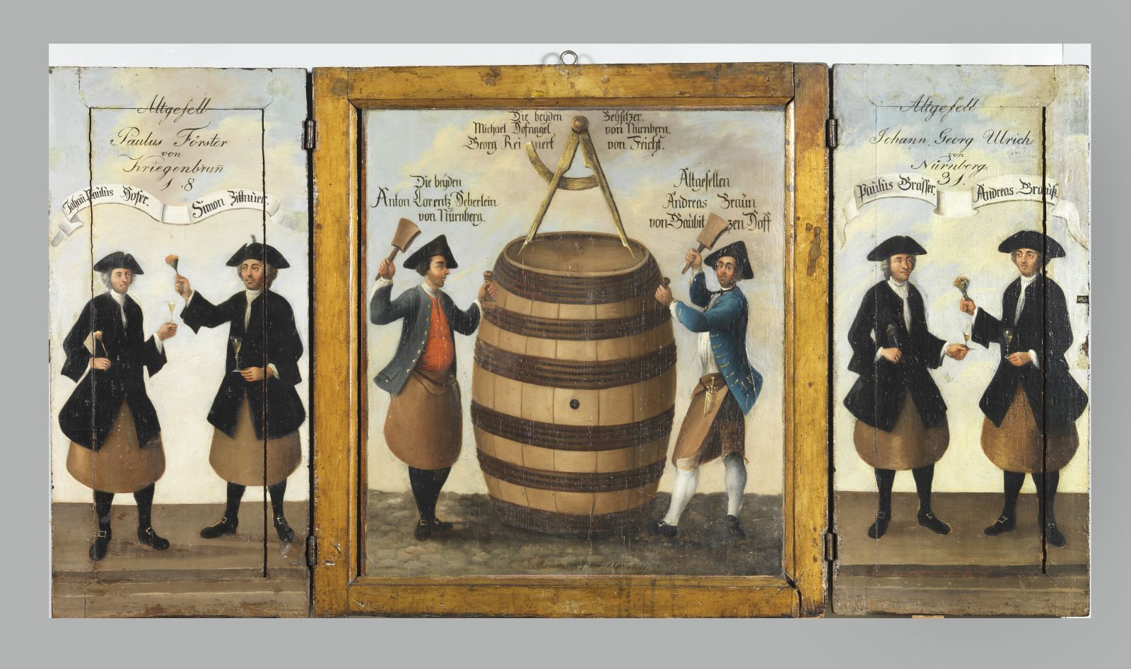 Die Klapptafel gehörte den Nürnberger Fassmachern. Im Streiflicht erkennt man eine untere Malschicht mit der Jahreszahl 1568. Das Objekt wurde über längere Zeit benutzt und mindestens zweimal umgearbeitet. Auf der linken Außenseite der Klapptafel steht eine Inschrift, die sich auf die Abnehmer und den Nutzen von Fässern bezieht. Rechts wird die Handwerksherberge beschrieben: als Anlaufstelle für wandernde Gesellen, als Versammlungsort des Handwerks, sowie als Informationszentrum für Kunden mit Notfällen. Öffnet man die Tafel mit dem eichelförmigen Schiebemechanismus, so sieht man Darstellungen von sechs Altgesellen mit Namen. Die Herren auf den Außenflügeln prosten sich zu, während die Männer auf der Mitteltafel gerade Fassreifen setzen. Zwei Beisitzer werden nur schriftlich erwähnt.