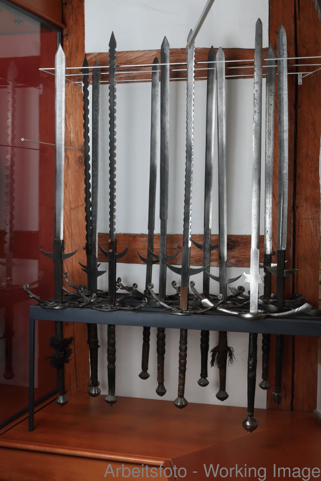 Eisen - geschmiedet, gestählt, geschliffen, teilw. punziert u. graviert; Holz - gedrechselt; Bezug: Leder, Textil
