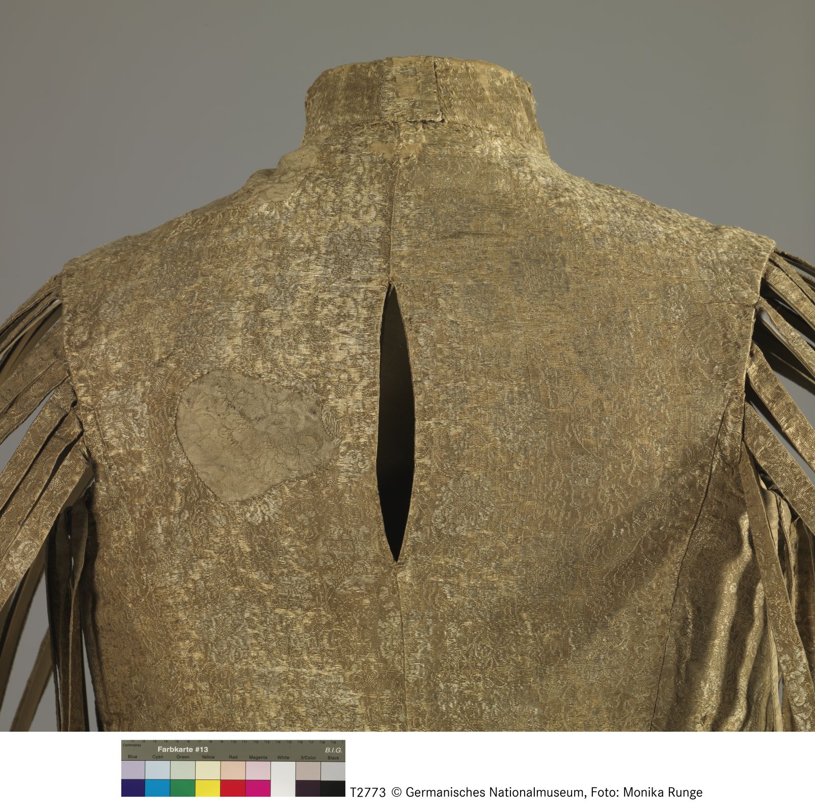 Seidengewebe, floral gemustert, goldbeige, Kragen und Bauchpartie versteift, Futter Seidentaft, Posamentenknöpfe, Obermaterial: Seidengewebe, goldbeige, Leinwandbindung mit Muster durch Schussflottierung, Kette: Seide, goldgelb, s-gedreht, 60 F/cm; Schuss: Seide, gelb, 2 s/S, weiß 2 s/S, 18 F/cm, Webkante vorhanden