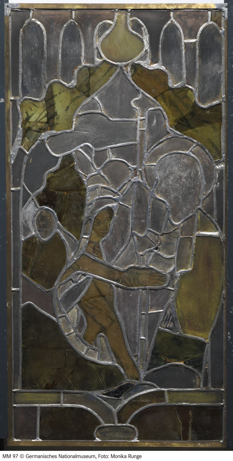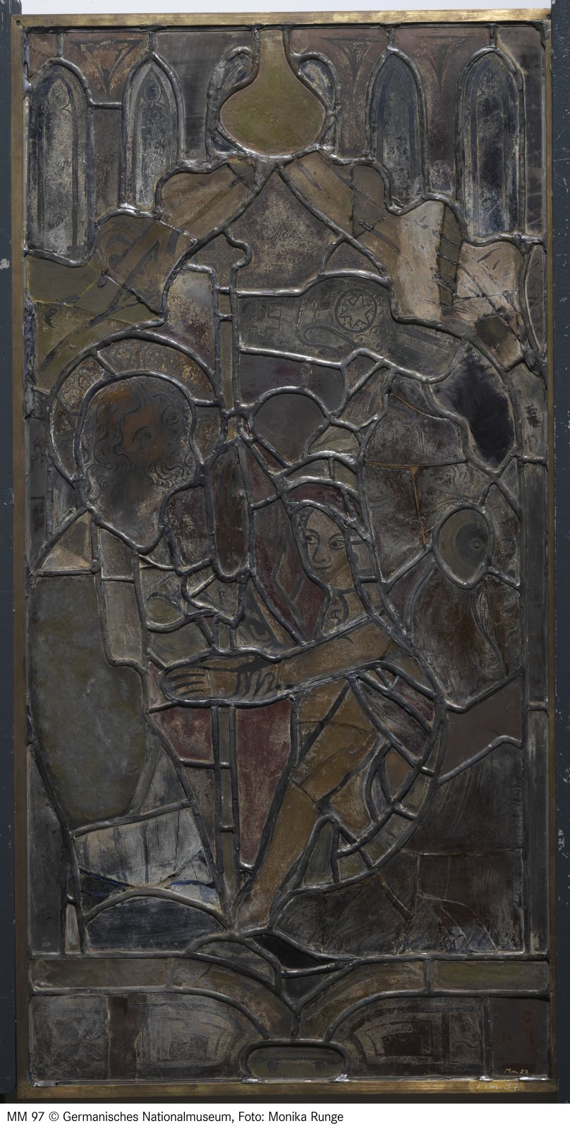 Farbiges Hüttenglas mit Schwarzlotmalerei und Bleiruten