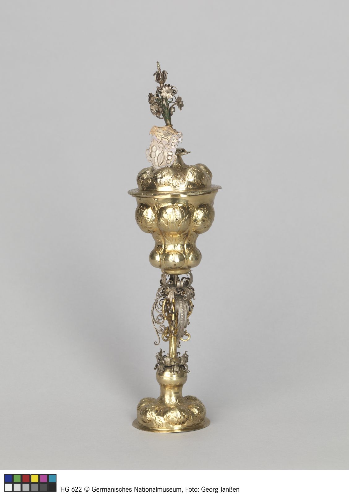 Silber, vergoldet, getrieben, gegossen,Ziseliert, geschnitten, kaltbemalt
