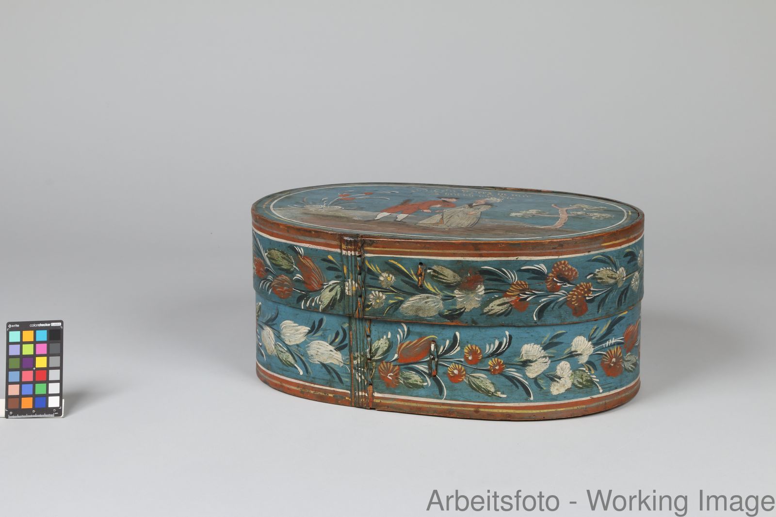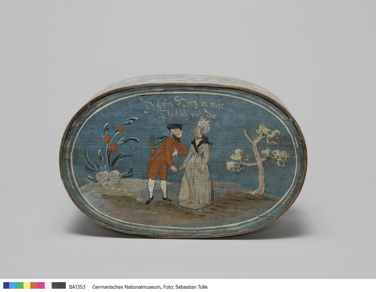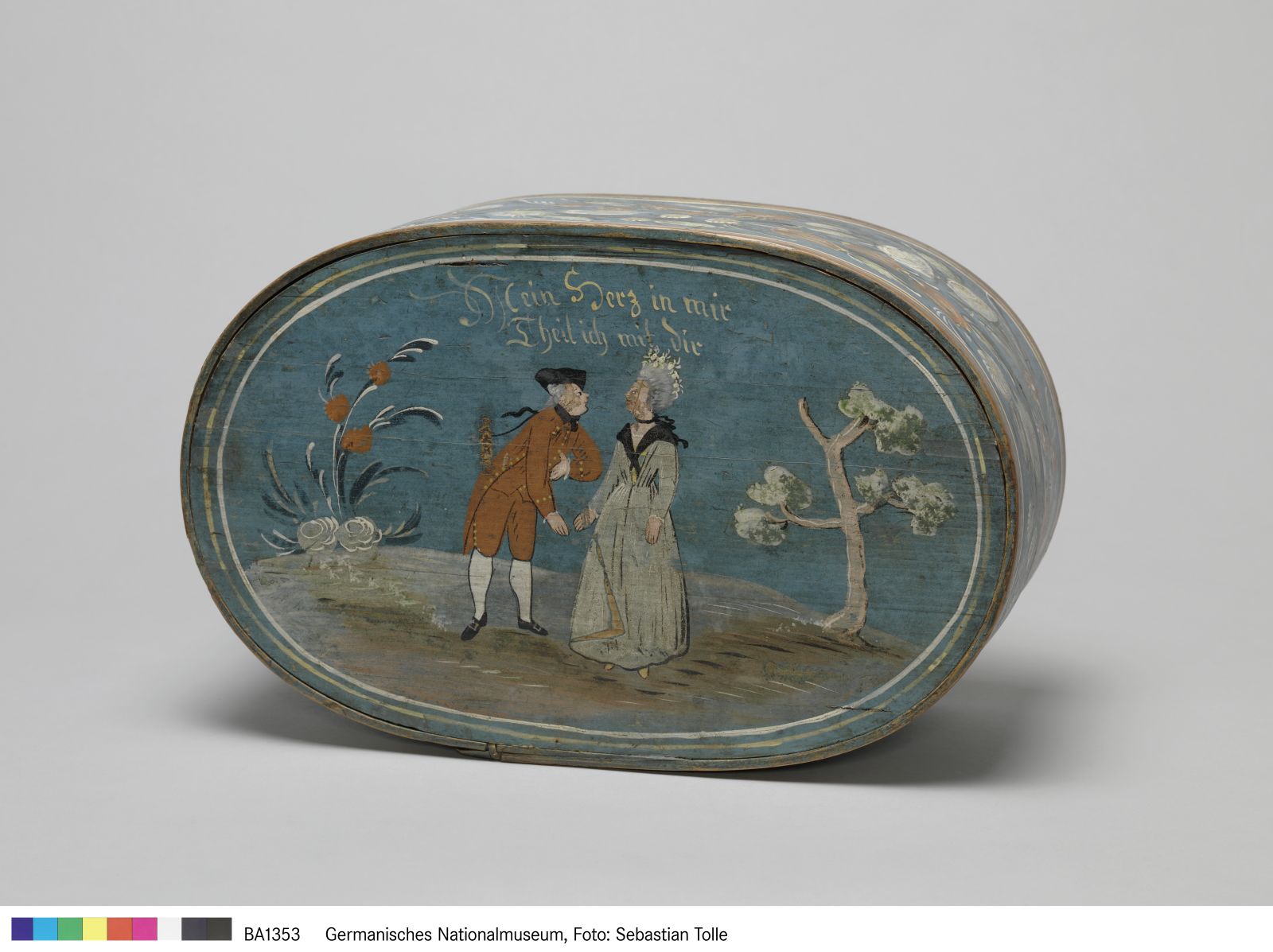 Auf dem Deckel ist ein höfisches Paar aus der Zeit um 1780 dargestellt. Der Herr, der sich vor der Dame verbeugt, trägt einen roten Rock, eine Kniebundhose und einen Dreispitz. Die Dame kleidet eine Haube, ein Schultertuch (Fichu) und ein langes Kleid. Farblich abgestimmte Blumen und ein Baum bilden einen landschaftlichen Hintergrund. Über dem Paar steht geschrieben: „Mein Herz in mir / Theil ich mit dir“. Derartige (Liebes-)Paare und ähnliche Sprüche bildeten ein besonders beliebtes Sujet auf den meist ovalen Spanschachteln.