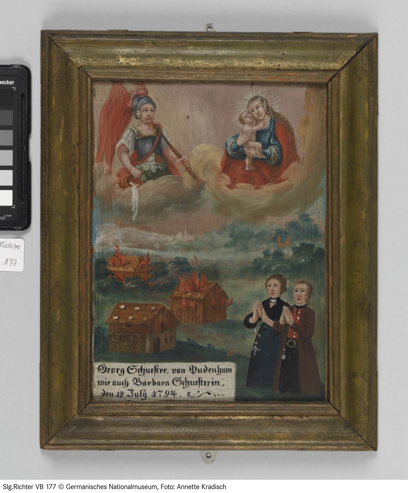 Heiliger Florian und Passauer Mariengnadenbild mit einem Votantenpaar und brennedem Haus
